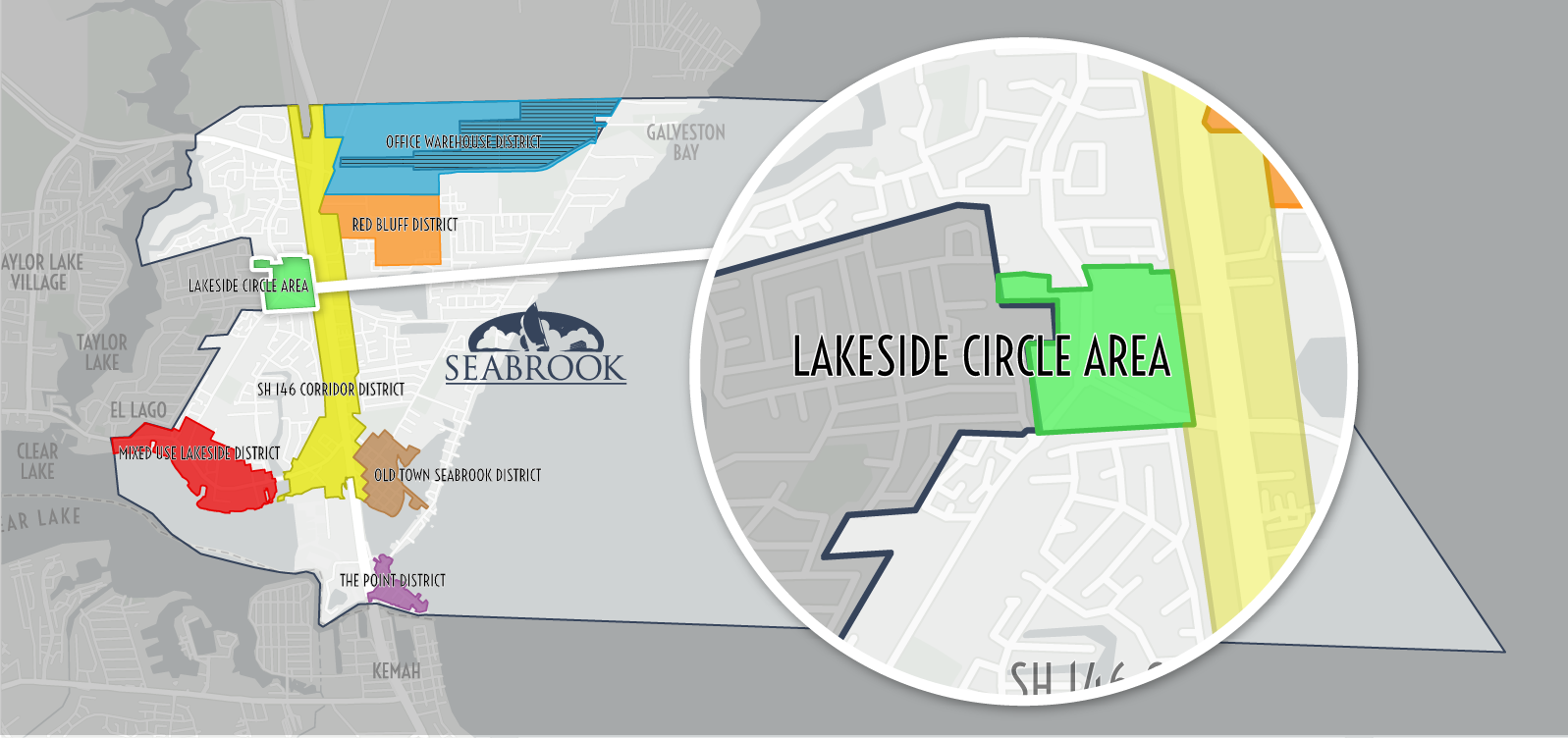 The Lakeside Circle Area is a 30+ acre master-planned, mixed-use retail development district between SH 146 and Lakeside Drive, zoned for Medium Commercial (C2). This district is poised to become one of Seabrook's largest retail developments, featuring a variety of retail stores, restaurants, and multifamily residential units. The development will focus on pedestrian connectivity, with trail connections enhancing the city's overall trail network. Greenspace and enhanced landscaping will be key elements in preserving the natural environment and creating a welcoming atmosphere. With access from SH 146 and Lakeside Drive, this area offers a prime relocation option for businesses impacted by the SH 146 expansion. The Lakeside Circle Area will significantly enhance Seabrook's economic vibrancy upon completion.