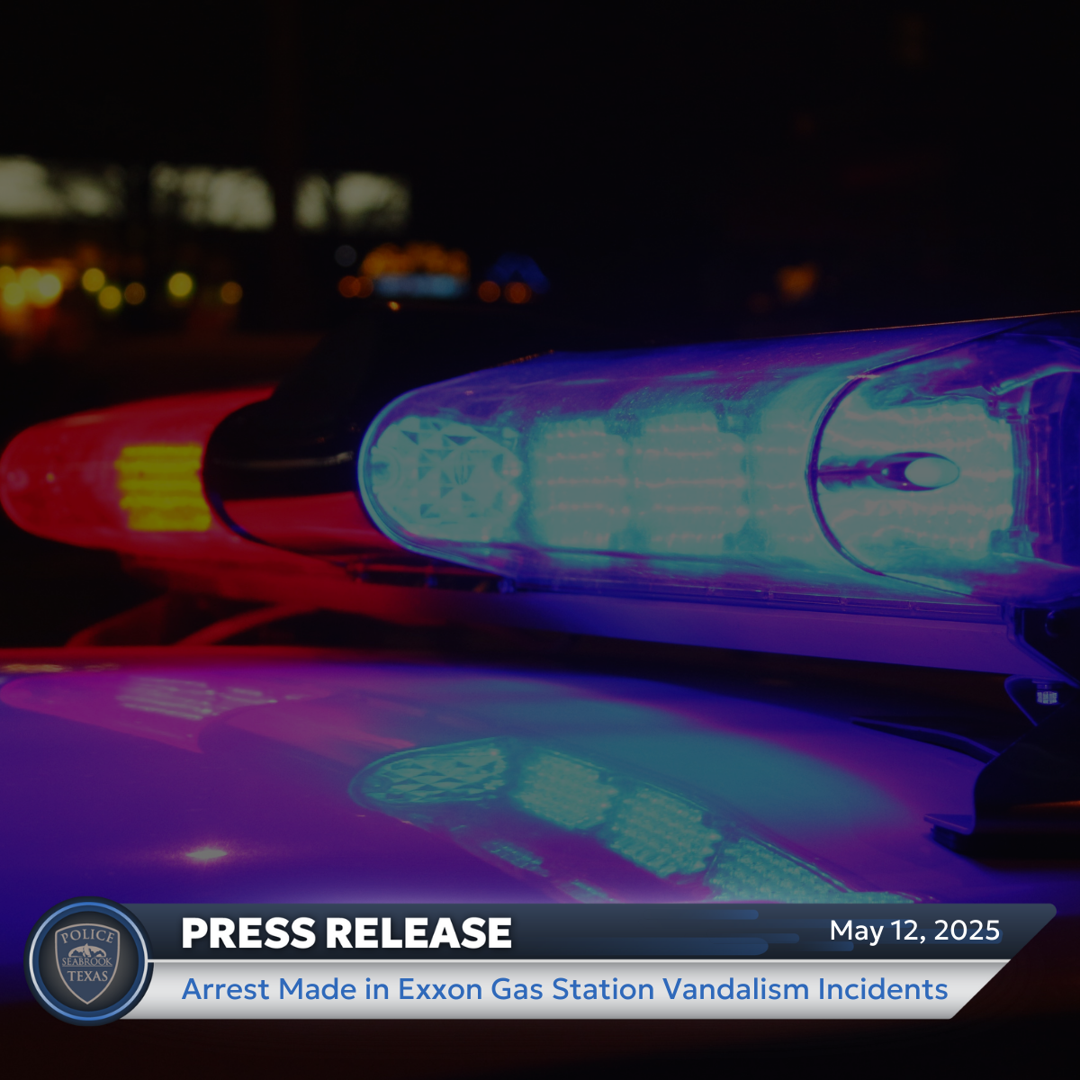 Seabrook, Texas - On Monday, May 12, 2025, at approximately 4:40 a.m., detectives and patrol personnel from the Seabrook Police Department arrested a male suspect believed to be responsible for a series of vandalism incidents targeting the Exxon gas station and convenience store located at 3308 Bayport Blvd. The suspect is accused of shooting ball bearings at the business on at least fifteen separate occasions over a period exceeding one month.
