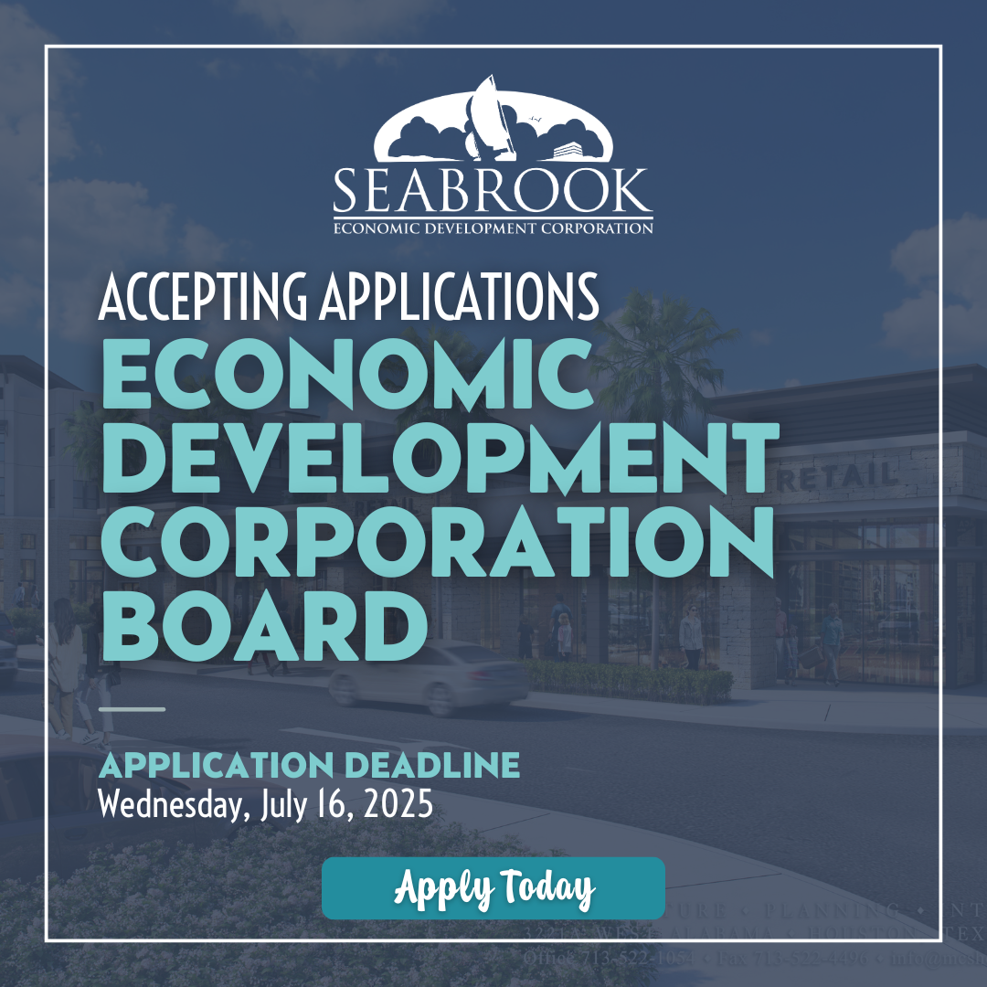 The City of Seabrook is currently accepting applications to fill 2 vacancies on the Seabrook Economic Development Corporation (SEDC) Board of Directors. Applications must be submitted by Wednesday, July 16, 2025, at 5 p.m.